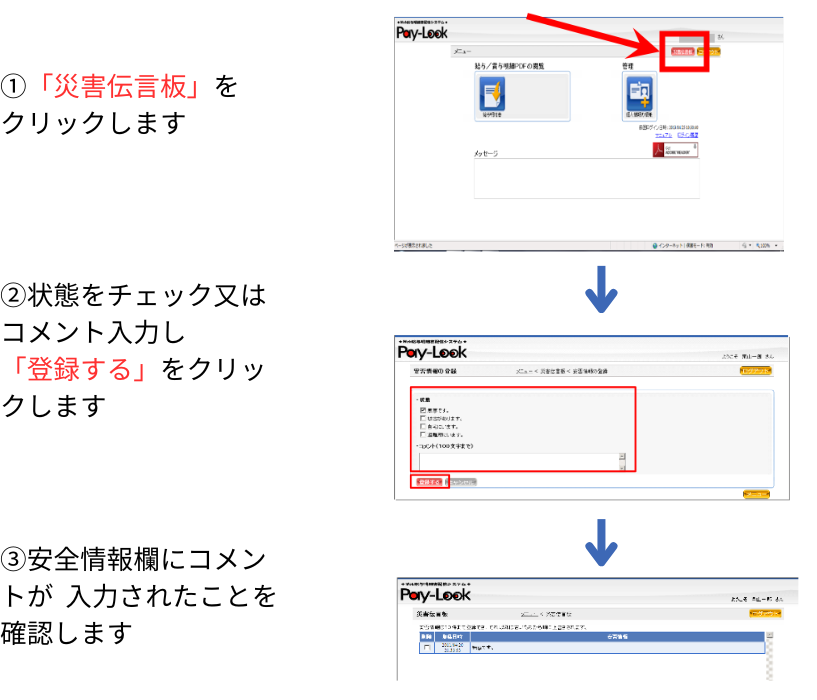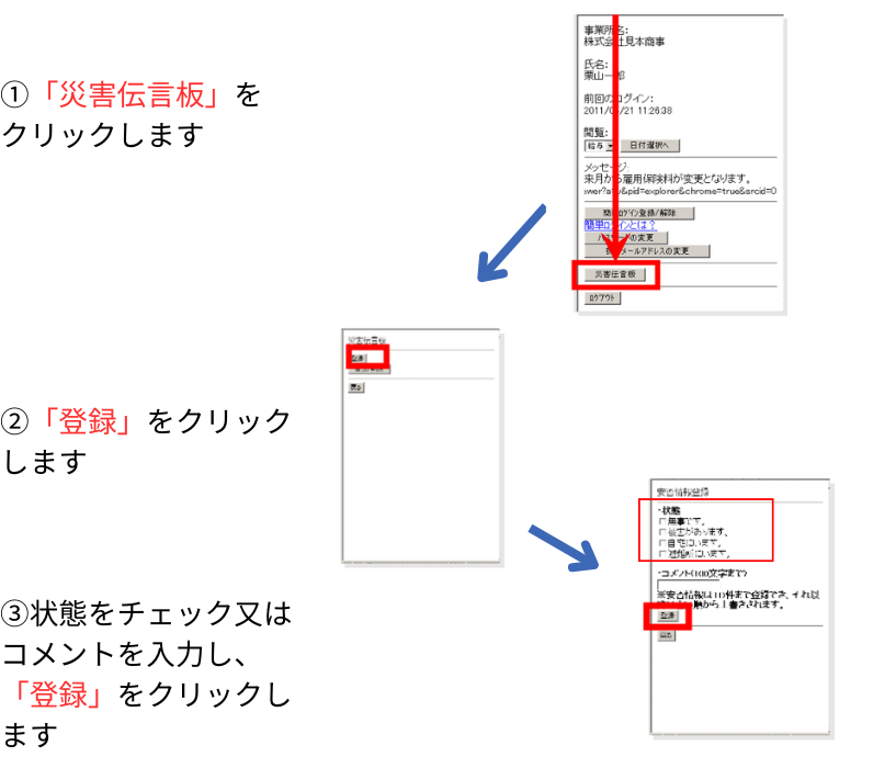 当社では、災害時の通信網混乱(電話・メールの不通など)に備えて、安全確認連絡システムを導入しています。災害時における当社への安全確認連絡は、日頃ご利用されているWeb給与明細画面にある「災害伝言板」をご利用ください。 (インターネットが通じない場合は、電話・メールなどで連絡を取ってください)
