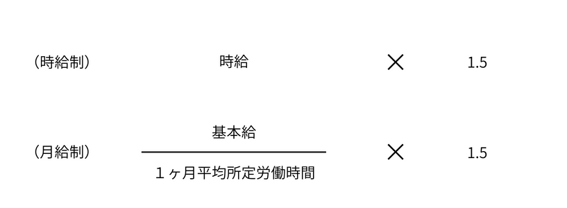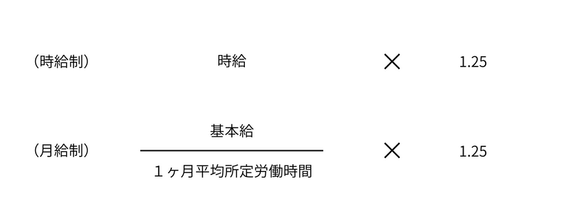 - 法定労働時間を超えた勤務時間(法定外休日労働を含む)が60時間以内の場合は、その勤務1時間についての支給額を次のとおり計算する。