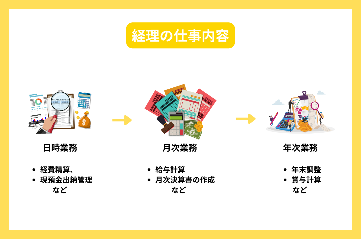 経理の仕事は、大きく「日次業務」「月次業務」「年次業務」の3つに分類できます。以下では、それぞれのサイクルごとに具体的な仕事内容を解説します。