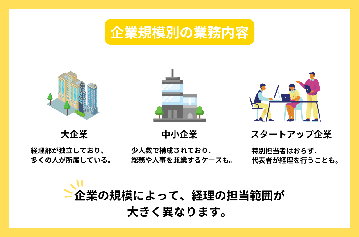 経理の仕事は、企業規模により担当範囲が大きく異なるのが特徴です。以下では、経理の業務内容を企業規模別にご紹介します。