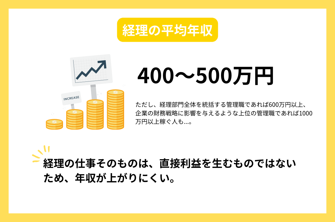 また、経理は直接利益を生む部門ではないことから年収が上がりにくい傾向にあるので、経理で高収入を目指すのであれば、基本的に何らかの役職に就く必要があります。