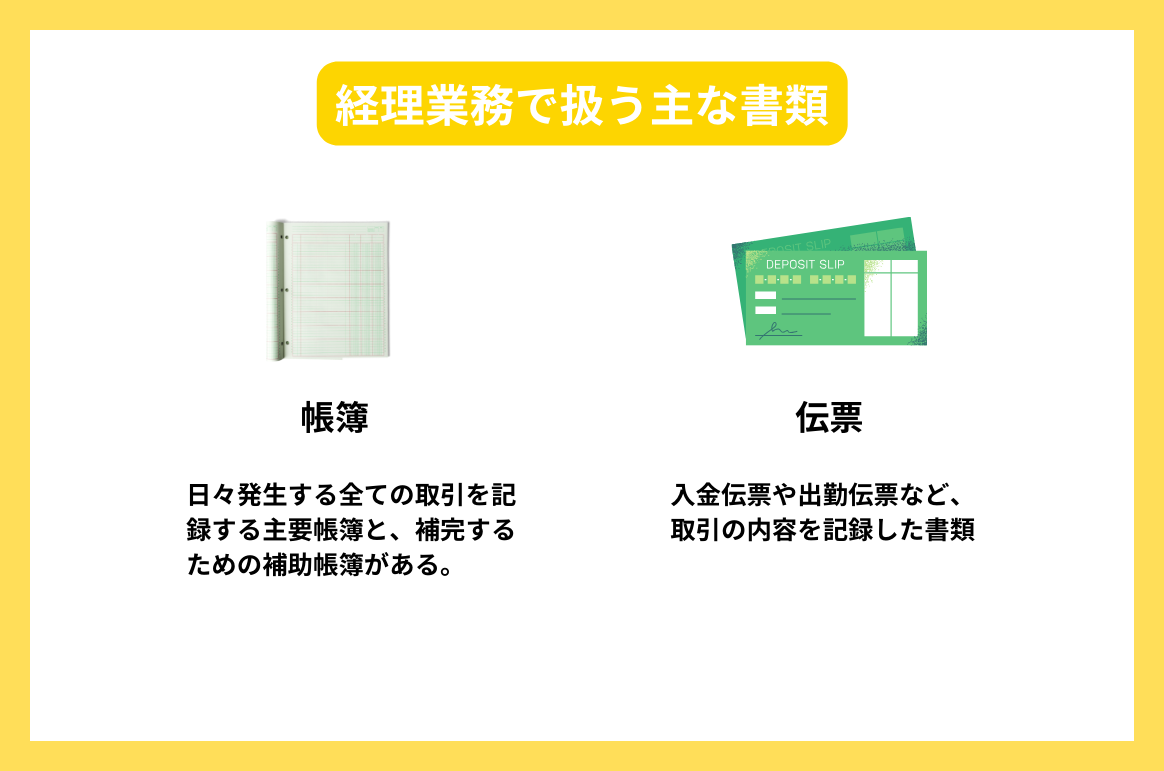 経理業務では、主に「帳簿」と「伝票」を用いて取引の記録をします。