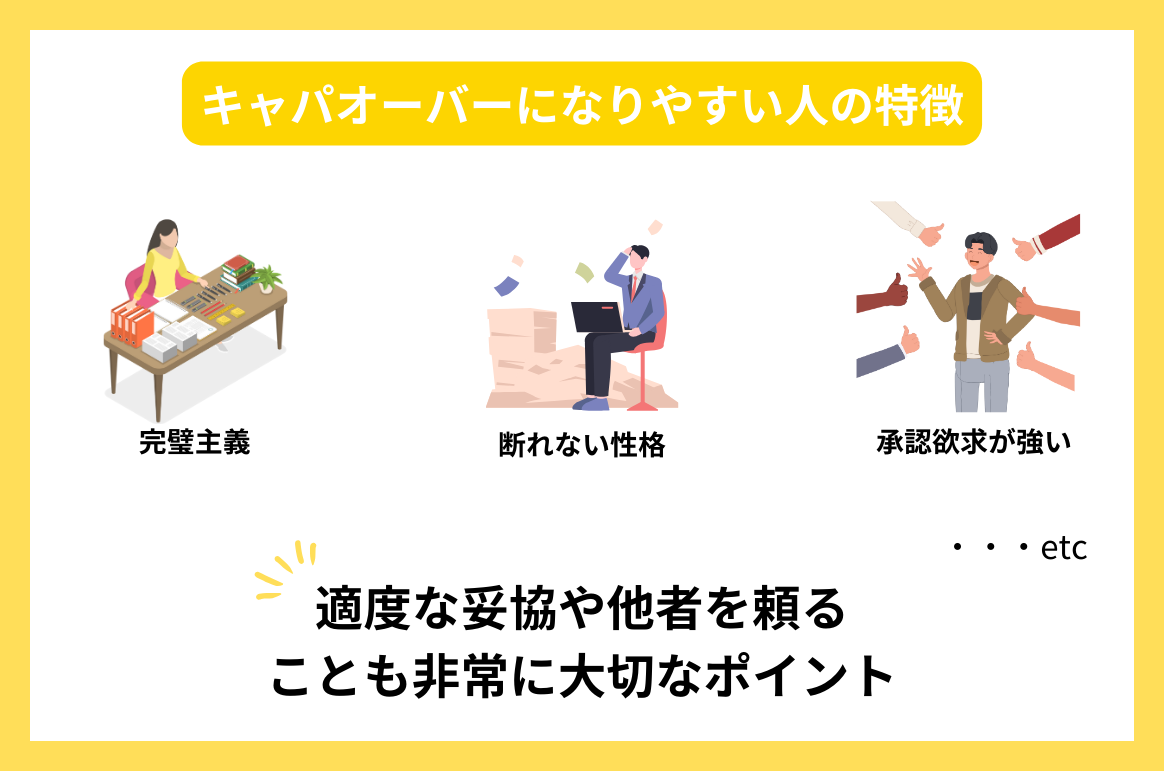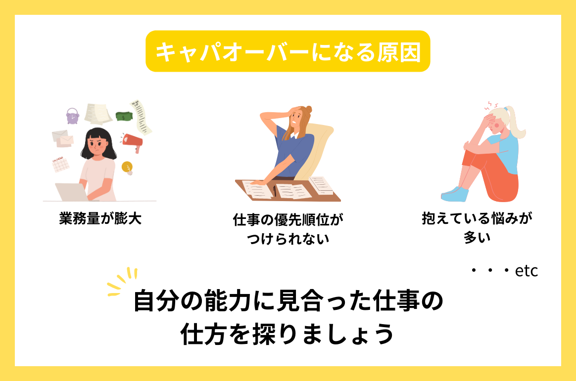 自分の能力を理解できていない・段取りを組むのが苦手・新入社員である場合も、担当している業務が多すぎるために、キャパオーバーに陥りやすいため、注意をしましょう。