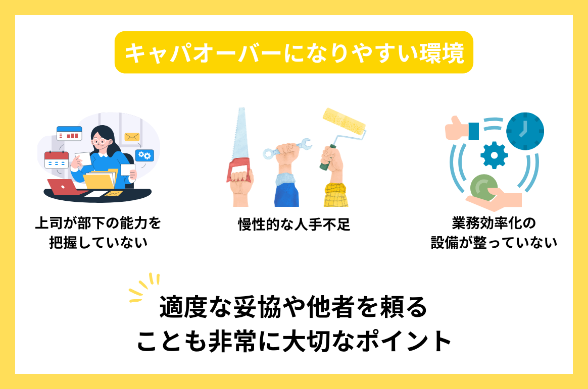 キャパオーバーになるのは、 自分自身に問題があることも考えられますが、なりやすい環境に身を置いていることも、要因となっているケースがあります。従業員がキャパオーバ-になりやすい環境を、いくつか解説していきます。