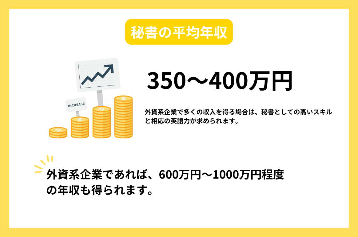 雇用形態や業務範囲、個人のスキルなどにより異なりますが、秘書の平均年収は350~400万円程度です。この金額は、日本の平均年収と比較すると低い傾向にありますが、一般的な事務職のなかではやや高いと言えます。