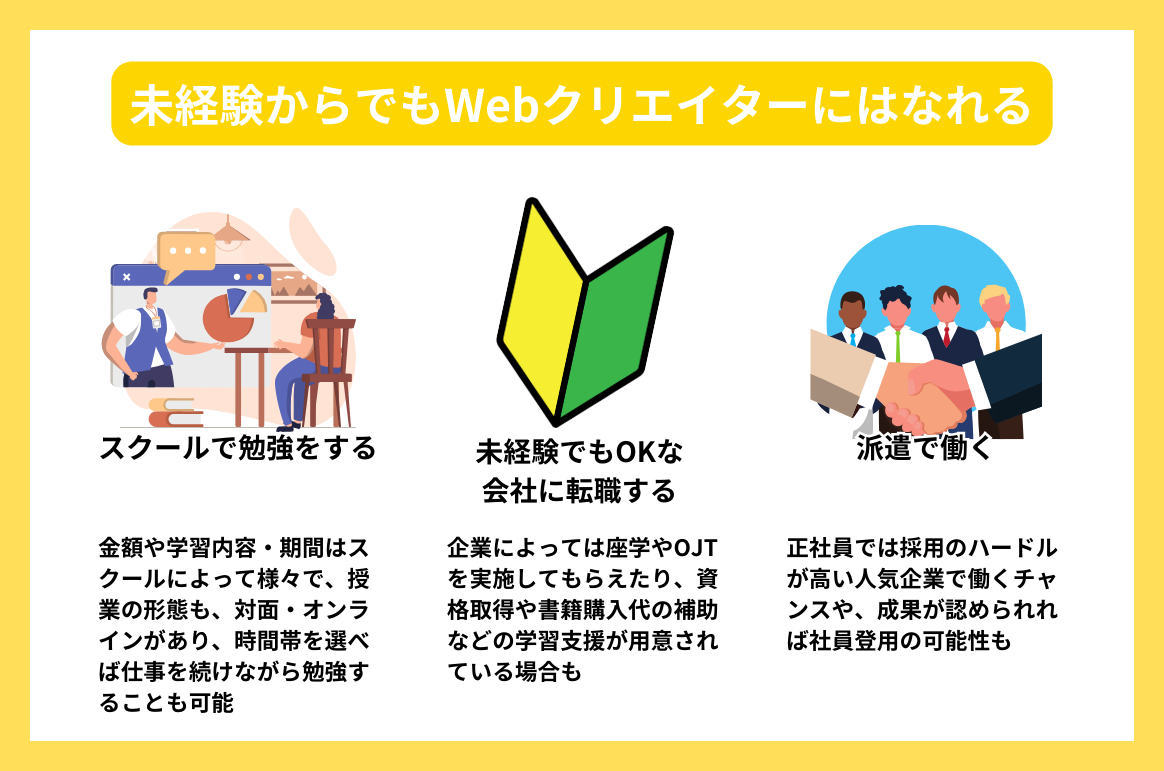 Webクリエイターに求められる専門性は高いものの、スクールで学習したり、お仕事選びを工夫することで未経験からのチャレンジも可能になります。